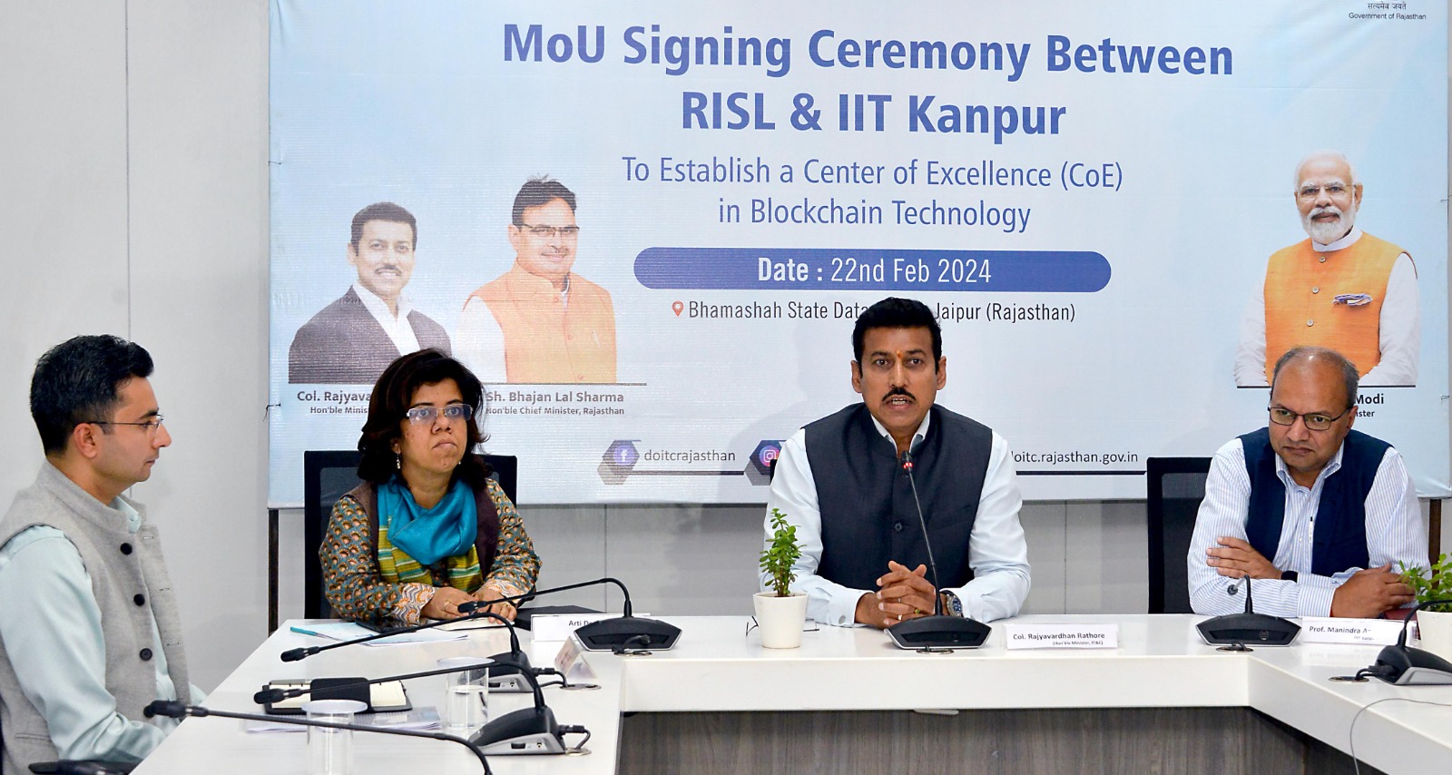 कर्नल राठौड़ गुरुवार को भामाशाह डेटा सेंटर में राजकॉम्प इन्फो सर्विसेज लिमिटेड (आरआईएसएल) और भारतीय प्रौद्योगिकी संस्थान कानपुर (आईआईटी कानपुर) के बीच एक समझौता ज्ञापन (एमओयू) पर हस्ताक्षर कार्यक्रम को संबोधित कर रहे थे। उन्होंने कहा कि ब्लॉकचेन तकनीक के क्षेत्र में आईआईटी कानपुर ने विश्वस्तर पर अपनी विशिष्ट साख कायम की है। कर्नल राठौड़ ने कहा कि 'लैब से लैंड' तक और 'रिसर्च से रियल टाइम यूजेज' तक सूचना प्रौद्योगिकी विभाग और आईआईटी कानपुर साथ मिलकर सुरक्षित और बेहतर सुशासन की दिशा में कार्य करेगा।